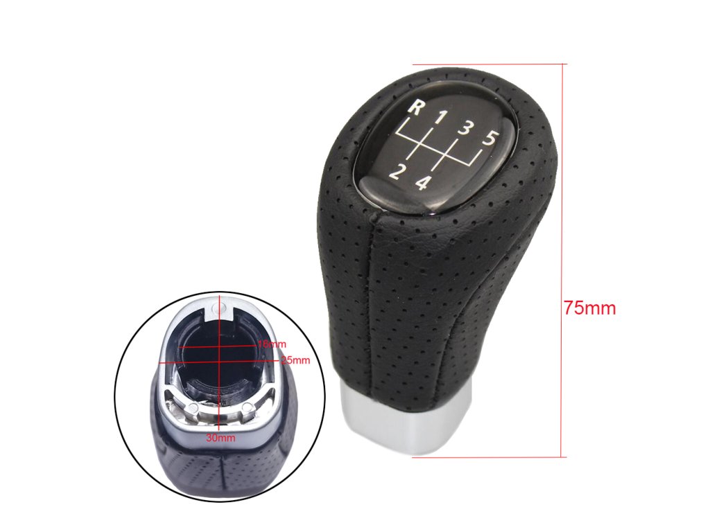 Hlavice řadící páky BMW E63 2004-2010 5st. Je určena pro manuální 5ti stupňovou převodovku. Materiál: vysoce kvalitní Pu kůže. Průměr otvoru pro řadící tyč je 16 mm.