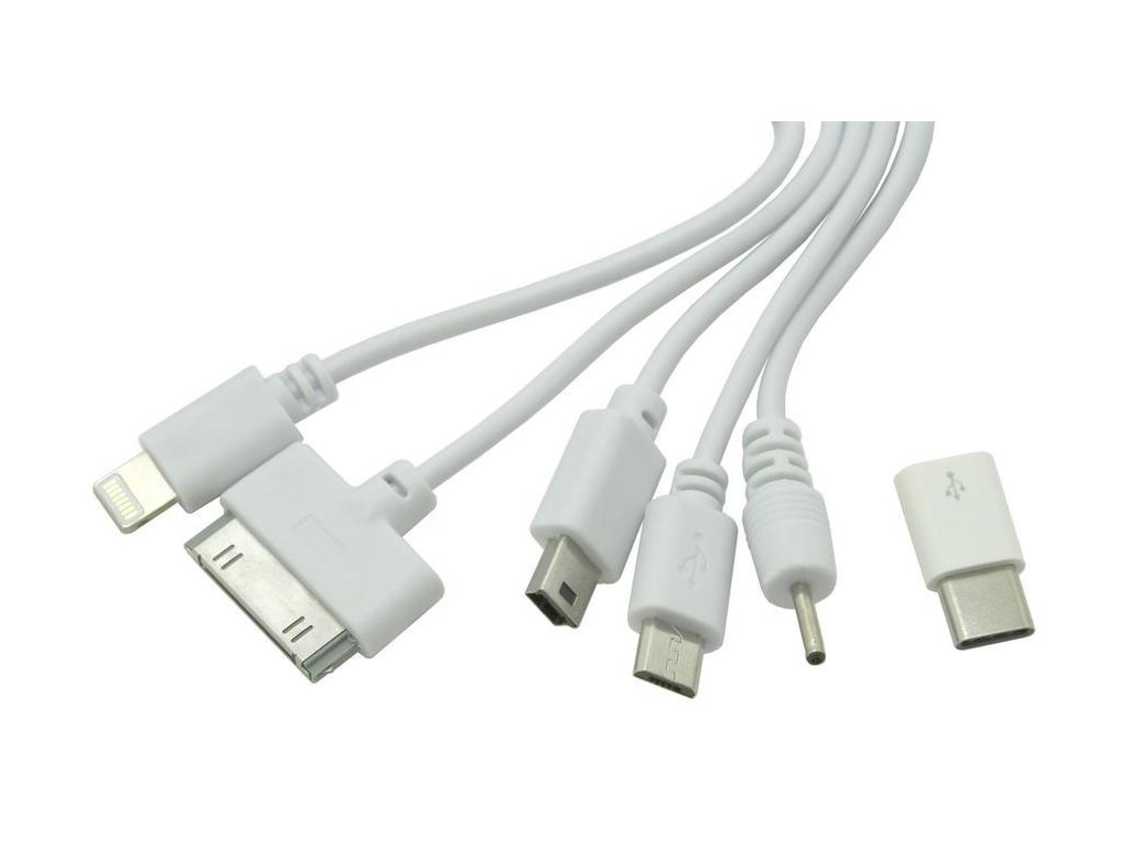Balení obsahuje USB nabíječku s 12-24V napájením, USB nabíjecí adaptér 230V, propojovací kabel s integrovanými konektory (iPhone 4, iPhone 5-6-7-8-X, Nokia 2 mm, Mini USB a Micro USB s redukcí na USB-C)