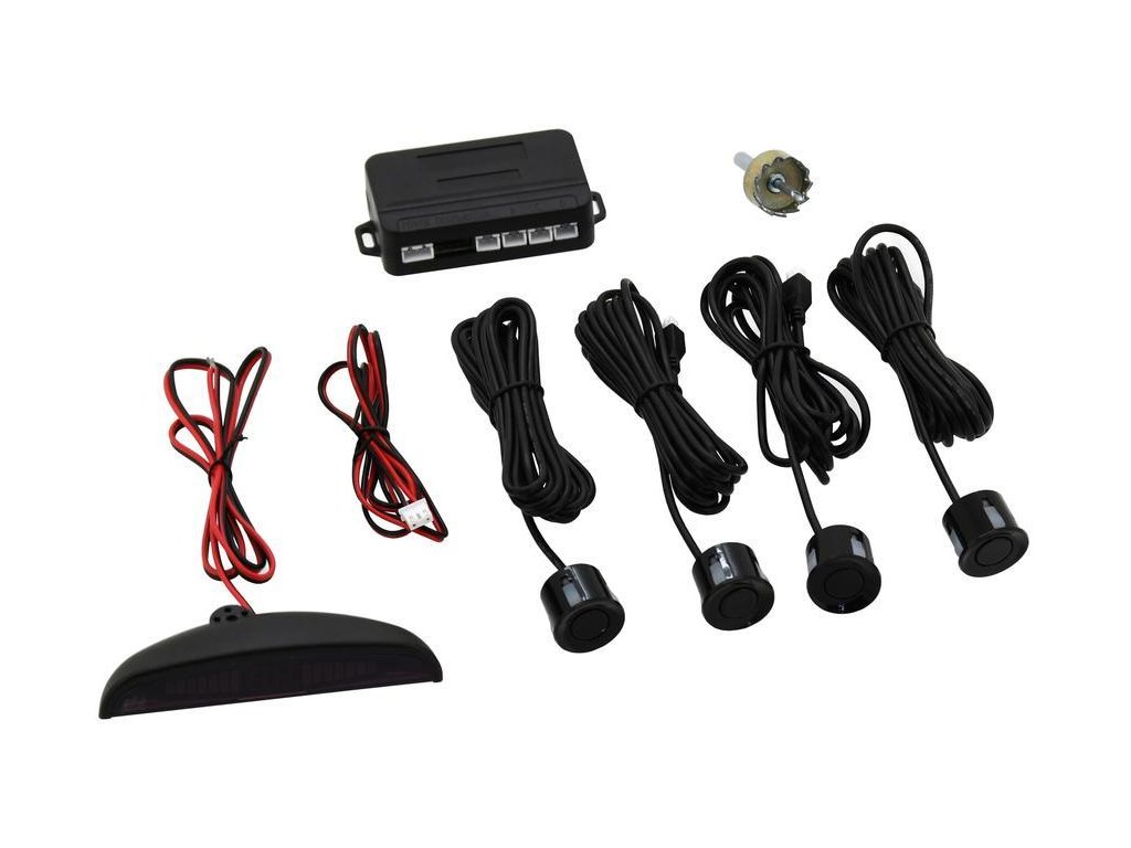 Balení obsahuje displej, řídící jednotku, 4 senzory pro montáž do zadního nárazníku, odpovídající kabeláž a vrták odpovídajícího průměru.
