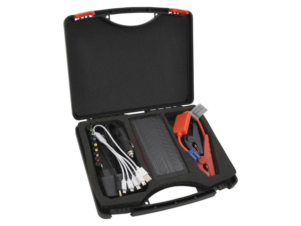 Powerbanka s funkcí nouzového startování vozidla, s LED displejem zobrazujícím aktuální stav nabití a dalším příslušenstvím.