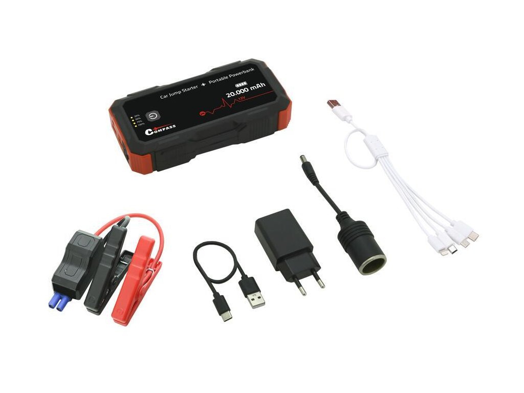 Balení dále zahrnuje kabel s adaptéry USB-C / micro USB / mini USB / iPhone. Powerbanka tak díky dvěma USB výstupům poslouží pro nabíjení vašeho smartphone, tabletu, či jakéhokoliv kompatibilního elektronického zařízení. Startovací zdroj je opatřen lithiovou baterií kterou je možné dobíjet pomocí USB kabelu (5V / 2A), součástí balení je navíc adaptér pro připojení k 230V.