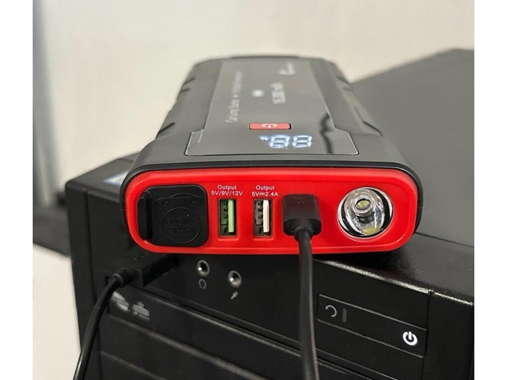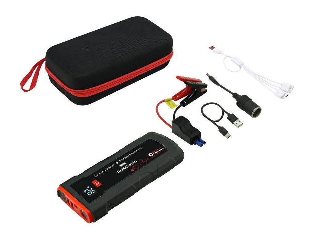 Powerbanka s rychlým nabíjením a funkcí nouzového startování vozidla pomocí Smart klipsů, s přehledným LED displejem zobrazujícím aktuální stav nabití powerbanky.