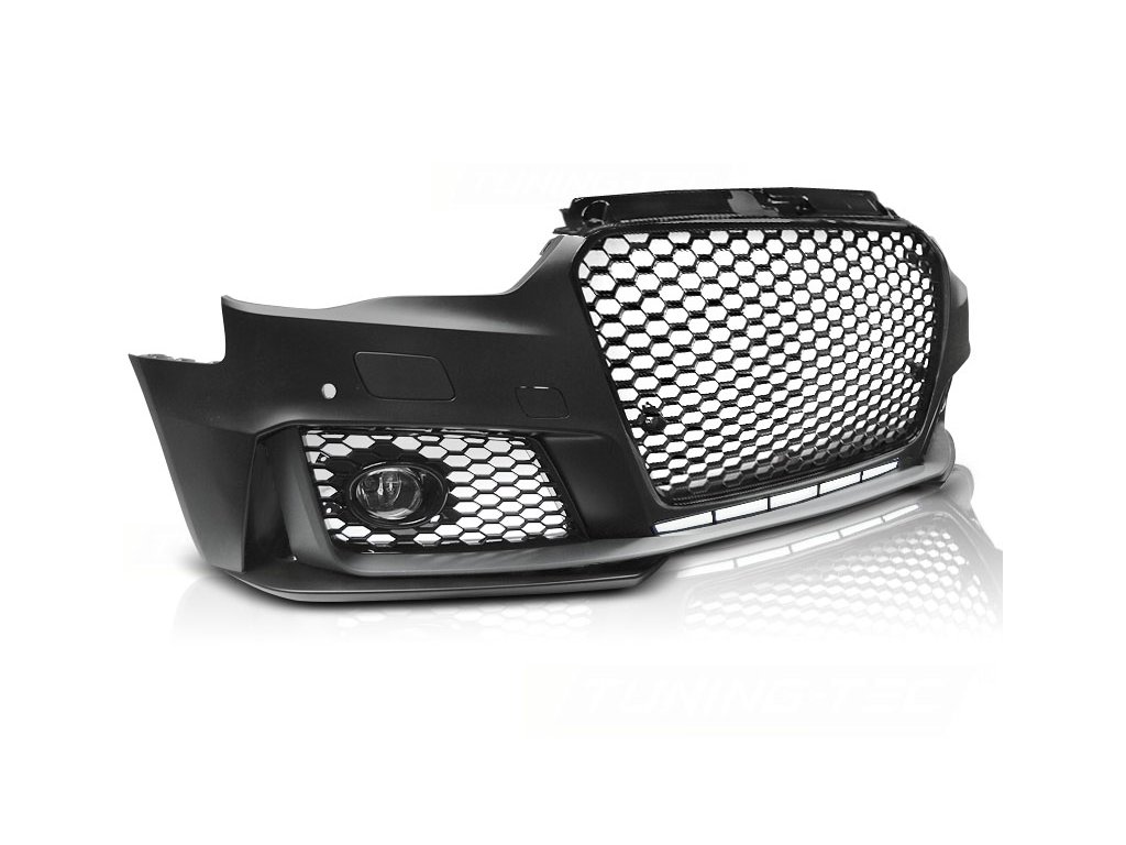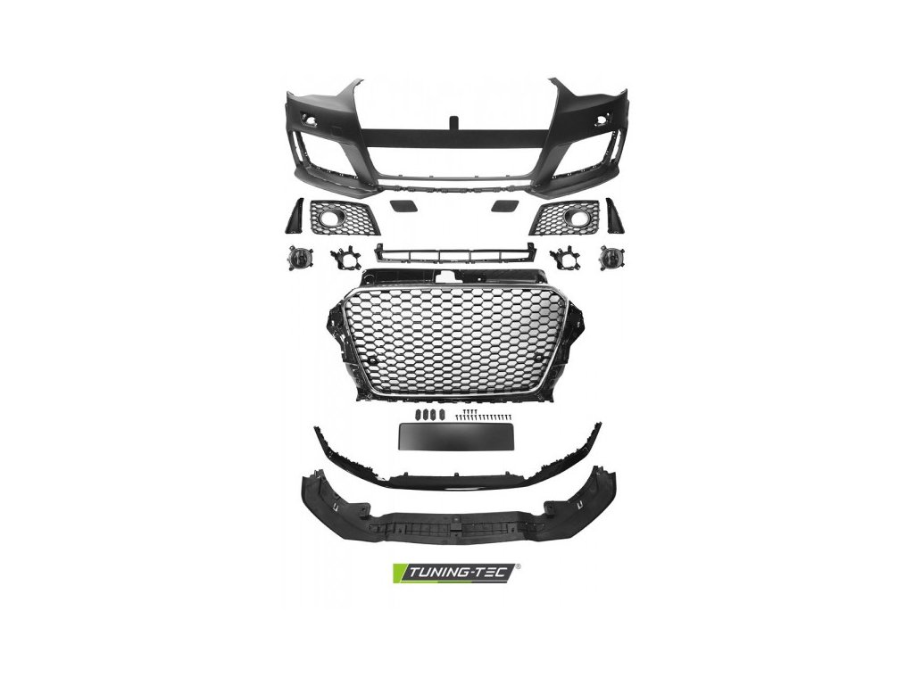 Přední nárazník AUDI A3 2012-2016 RS3 Style černá lesk PDC. Skvělá povrchová struktura umožňuje snadné lakování (výrobek je dodáván bez laku). Maska chladiče (černá lesklá), otvory pro parkovací senzory, držáky mlhových světel, mlhová světla, boční mřížky pro mlhovky, boční mřížky, držák SPZ, držák znaku (znak není součástí), záslepka pro tažné oko.