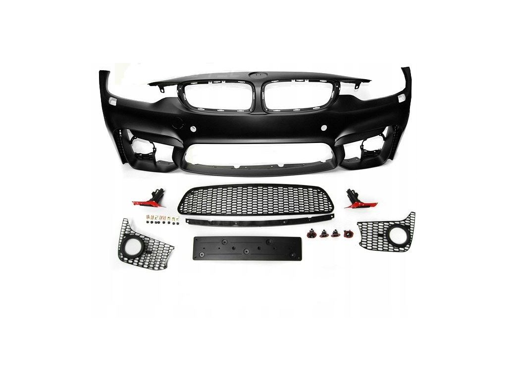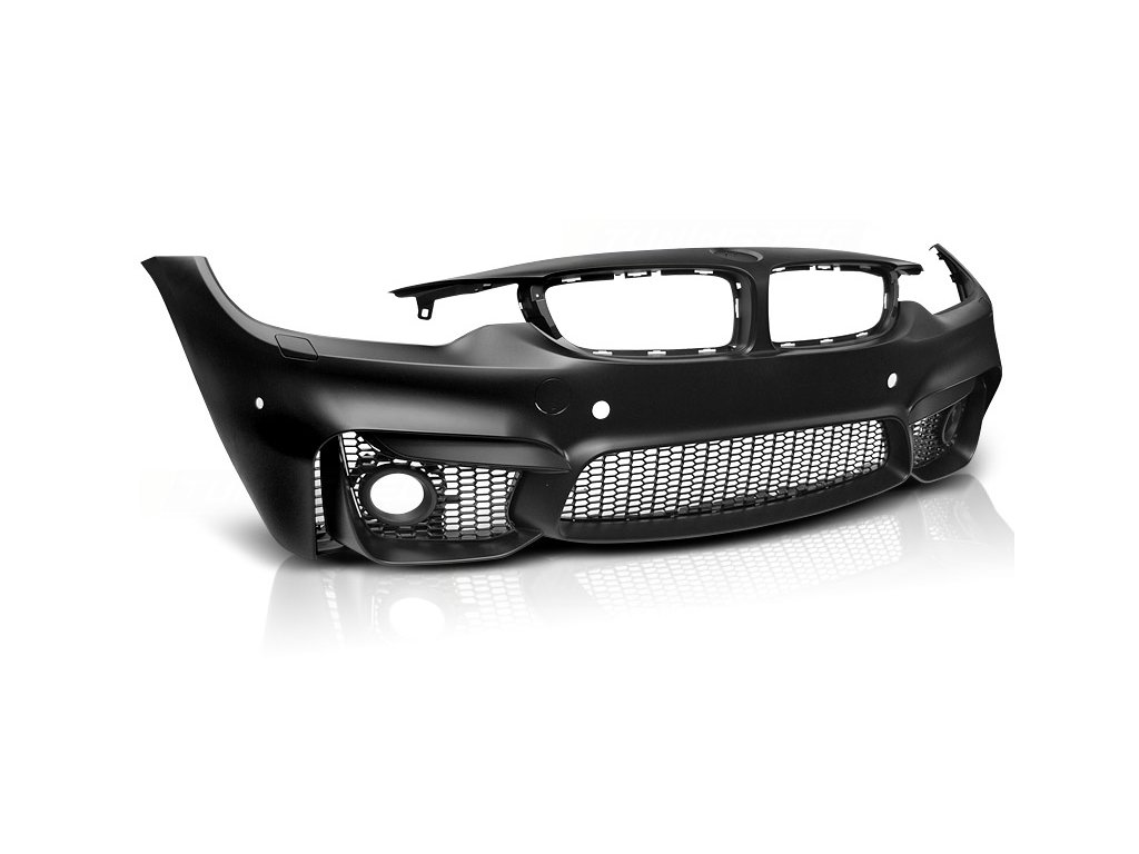 Přední nárazník BMW F32/F33/F36 10/2013-, M4 STYLE PDC. Skvělá povrchová struktura umožňuje snadné lakování (výrobek je dodáván bez laku). Otvory pro ostřikovače světel, záslepky ostřikovačů, držáky ostřikovačů, záslepka na tažné oko, spodní mřížka nárazníku, rámečky a držáky mlhovek (mlhovky nejsou součástí), rámeček pod SPZ.