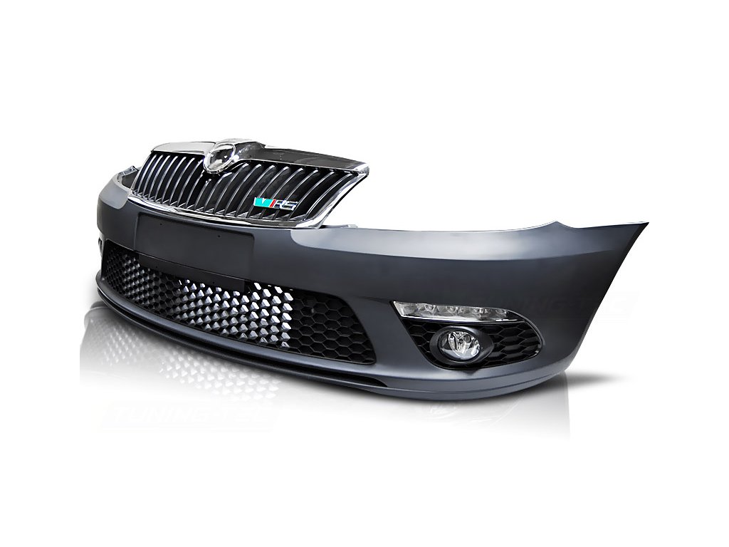 Přední nárazník Škoda Octavia II FL RS look 2009-2013. Zhotoveno z kvalitního PP polypropylenu. Sportovní vzhled modelu RS Kvalitní přesné zpracování Skvělá povrchová struktura umožňuje snadné lakování (výrobek je dodáván bez laku)Součástí balení je: chromovaná maska se znakem RS plastová mřížka nárazníku 2x boční mřížka nárazníku sada denních světel sada mlhových světel