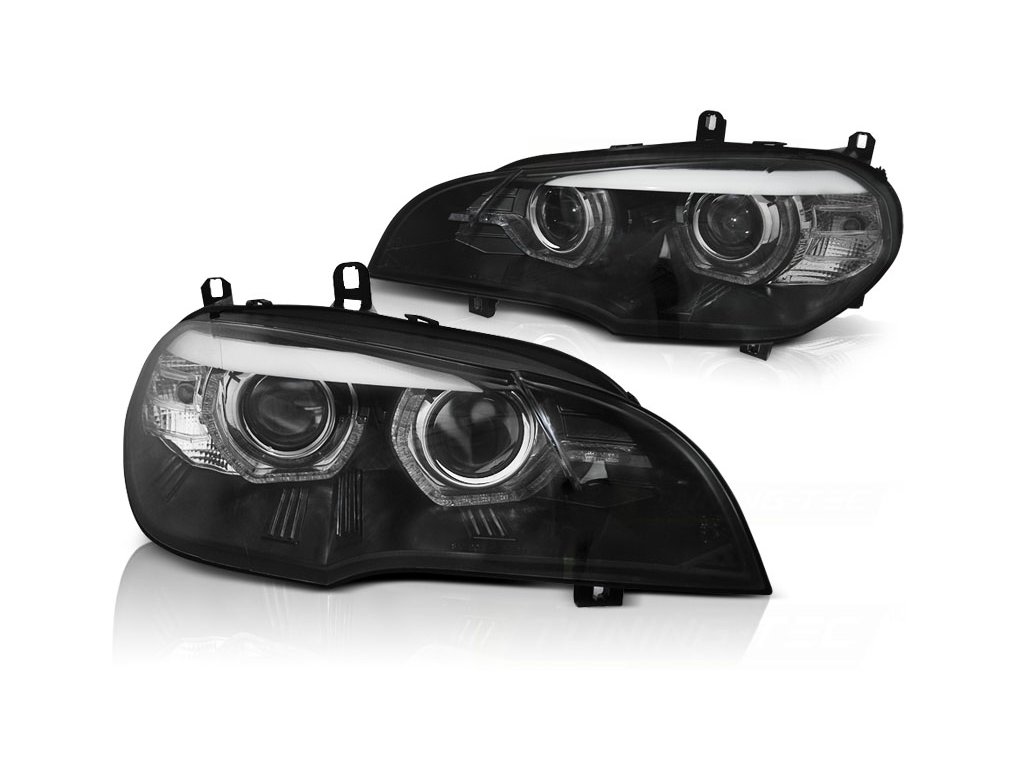 Přední světla xenon D1S 3D LED DRL angel eyes BMW X5 E70 2007-2010 černá. Přední světla čirá s LED kroužky pro denní svícení. Luxusní vzhled. High-Low čočka - současně pro potkávací i dálková světla. Pouze pro modely bez funkce AFS - natáčení do zatáček. Elektrické naklápění, včetně motorků. Homologace E4 a R87 je standardně vyznačena na světlech. Kvalitní světla od renomovaných výrobců. Přímá výměna za původní, bez úprav. žárovky: potkávací/dálková D1S (nejsou součástí balení), dálková H7 (nejsou součástí balení) parkovací LED kroužky, denní LED kroužky, blinkry PY21W.