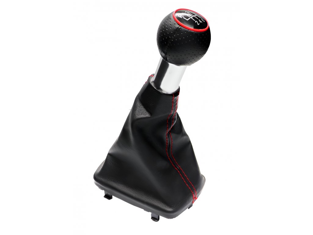 Řadící páka s manžetou Audi A4 B7 2004-2009 6st červená. Řadící páka je určena pro vozy s manuální 6-ti stupňovou převodovkou. Hlavice je černo-červená, manžeta je černá prošitá červenou nití. Průměr otvoru pro řadící tyč je 12mm.