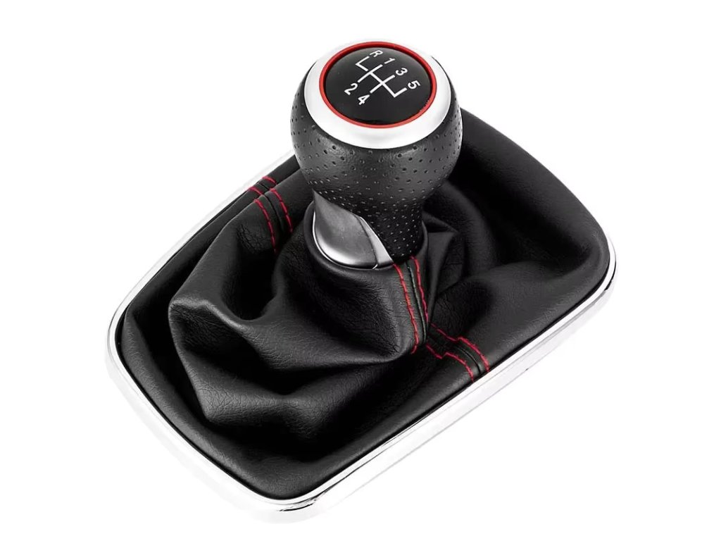 Řadící páka s manžetou VW Bora 1998-2005 5 rychlostní vzor AUDI. Hlavice je černo-červená, manžeta je černá s červenou nití. Průměr otvoru pro řadící tyč je 12mm. Manžeta je vyrobena z koženky, chromovaný rámeček z plastu. Určeno pro motorizaci 1.8, 1.9TDI, 2,0