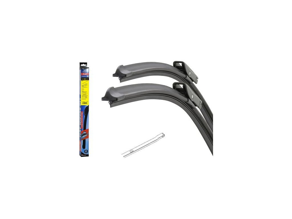 Sada dvou plochých stěračů FLAT (řidič + spolujezdec) se speciálním uchycením. Délky stěračů a systém uchycení na ramínko jsou přizpůsobeny vybraným vozům.